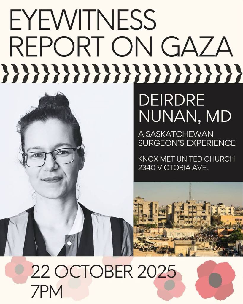 This event is presented by Doctors Against Genocide, Palestine Solidarity Regina, Amnesty International Saskatchewan, Regina Peace Council, Regina Public Interest Research Group, Students for Justice in Palestine, Faculty for Palestine, and Regina Making Peace Vigil.