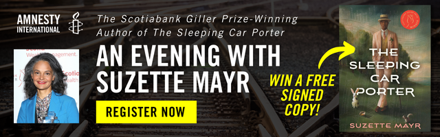 February 16 at 6pm Saskatchewan time: Join Amnesty International’s Book Club for an exclusive virtual event with Suzette Mayr, the Scotiabank Giller Prize-winning author of The Sleeping Car Porter. Register now, and you can win a signed copy of The Sleeping Car Porter. Don’t miss this exclusive event with one of Canada’s top writers! ASL interpreting and closed captioning will be provided.