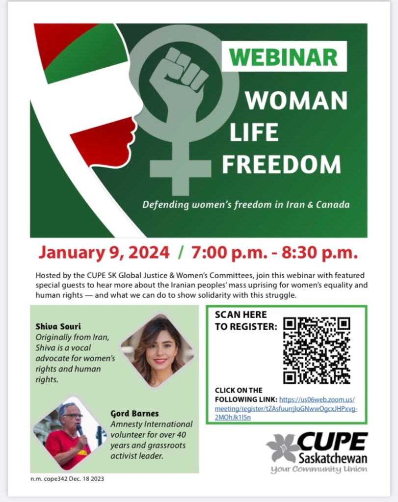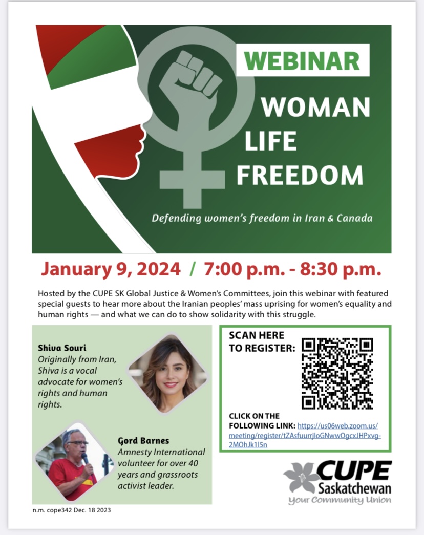 Hosted by the CUPE Saskatchewan Global Justice and Women’s Committees: join this webinar with special guests to hear more about the Iranian peoples mass uprising for women’s equality and human rights – and what we can do to show solidarity with this struggle.
