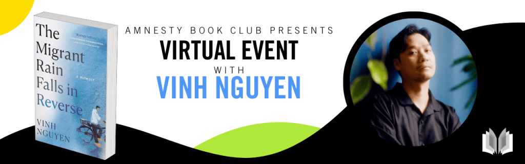 | Join us for a live online Amnesty Canada Book Club event for World Refugee Day with Vinh Nguyen, the Canadian author of the memoir “The Migrant Rain Falls in Reverse.” June 20th at 5pm Saskatchewan time. Along with his mother and siblings, Nguyen was one of millions of refugees who fled Vietnam by boat after the Fall of Saigon in 1975. Decades later, Nguyen goes looking for answers about his father, who left separately and mysteriously vanished. |