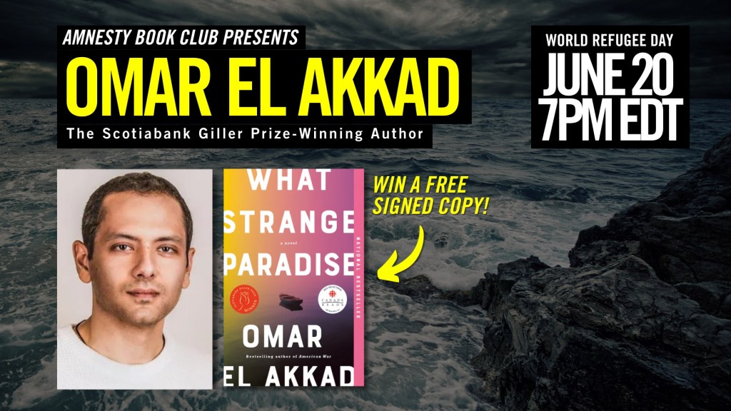 June 20th (at 5pm Saskatchewan time): you are invited to Amnesty International Canada’s virtual event with Omar El Akkad, the Scotiabank Giller Prize-winning author of What Strange Paradise.