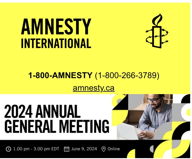 Amnesty International Canada Section (English Speaking) is thrilled to announce we will be holding the 2024 Annual General Meeting (AGM) from 1-3 PM (13:00-15:00 EDT) on Sunday, June 9, 2024.