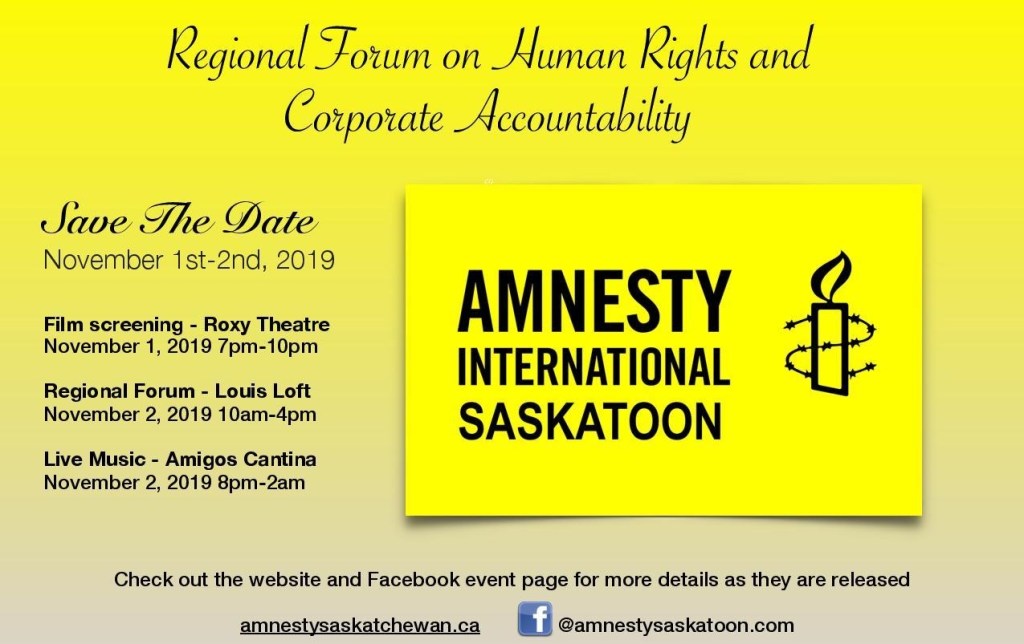 November 2nd…. we invite you to our exciting Amnesty International Regional Conference that will be held in Saskatoon. This conference is being organized by the Saskatoon Amnesty International Community and University groups.