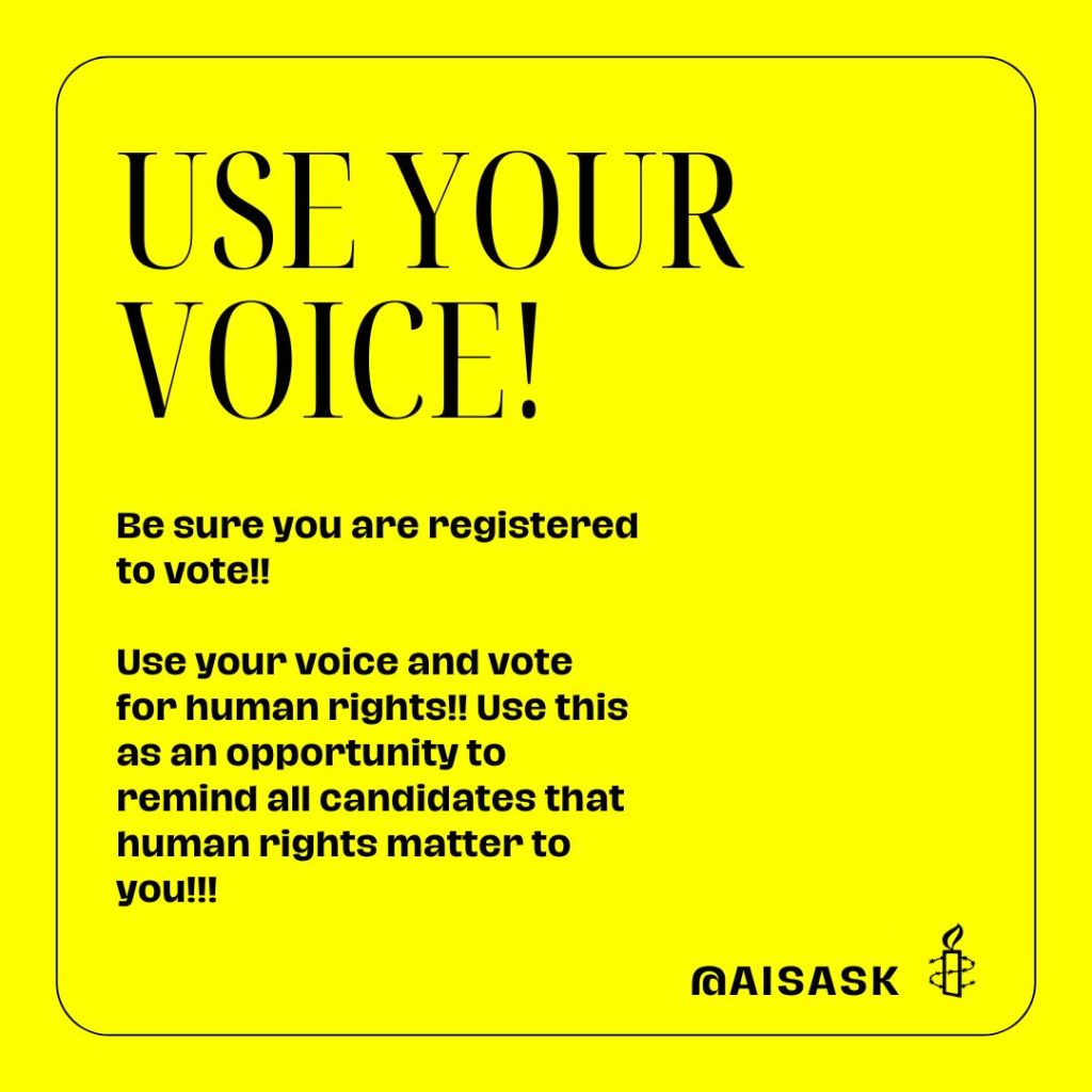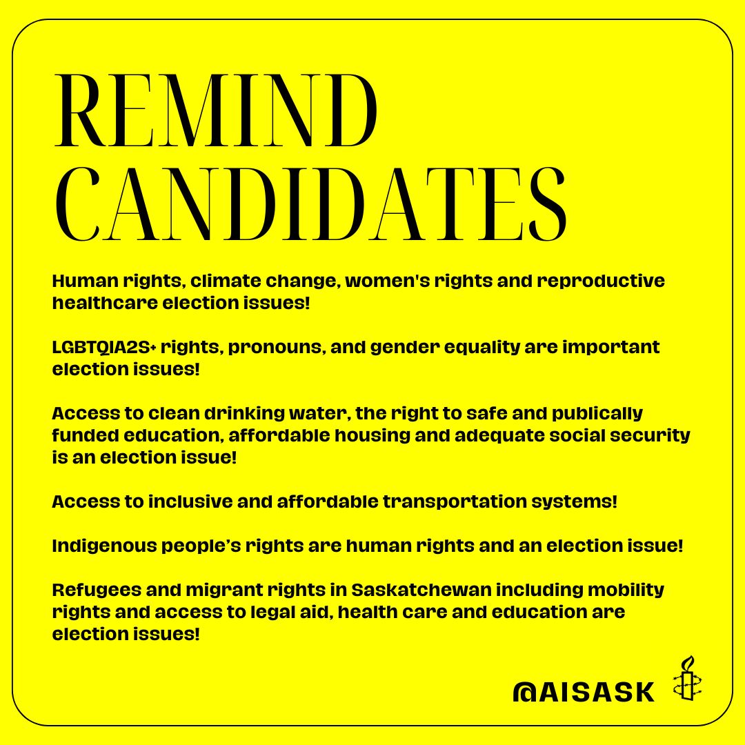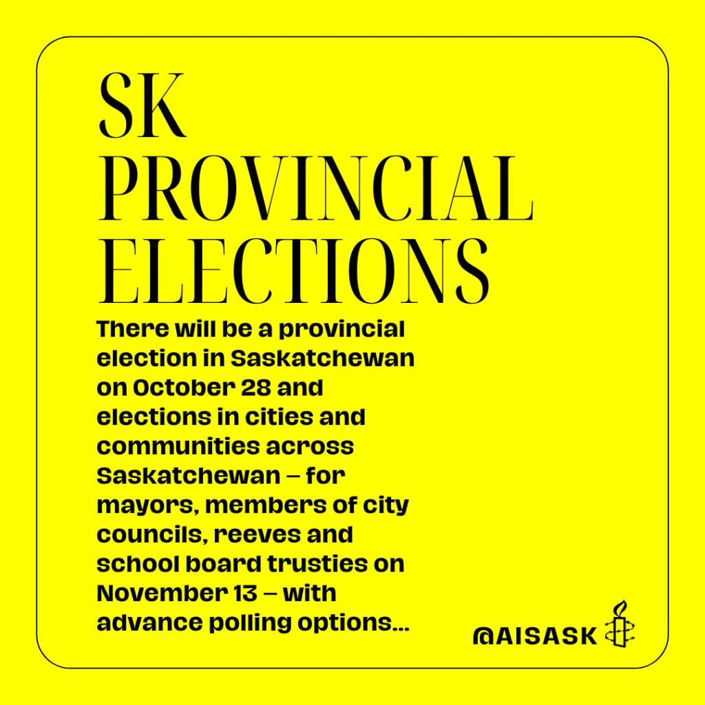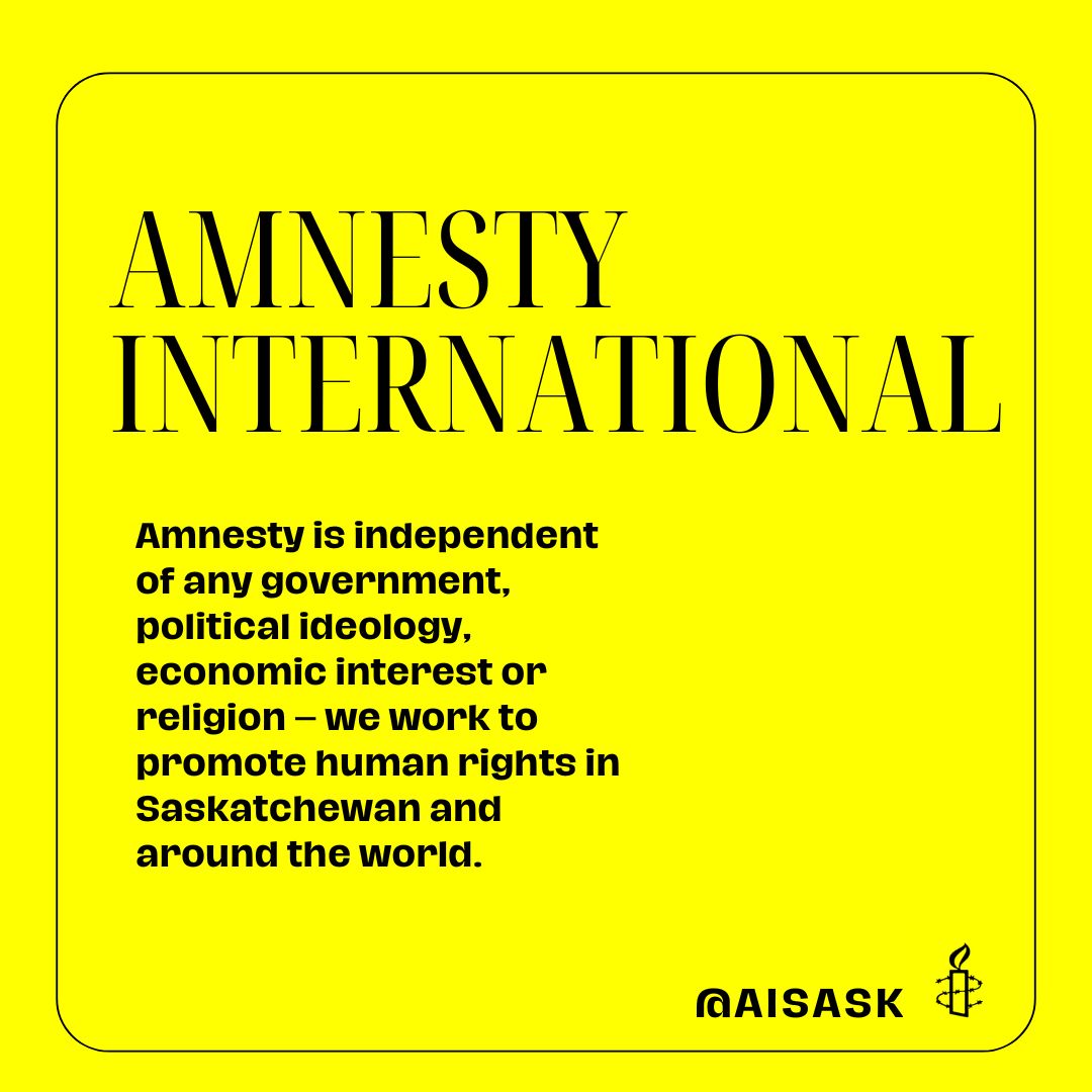 Saskatchewan Provincial and Local Elections: Human Rights Matter Amnesty International is independent of any government, political ideology, economic interest or religion – we work to promote human rights in Saskatchewan and around the world. Share this: Click to share on X (Opens in new window) X Click to share on Facebook (Opens in new window) Facebook Like Loading...