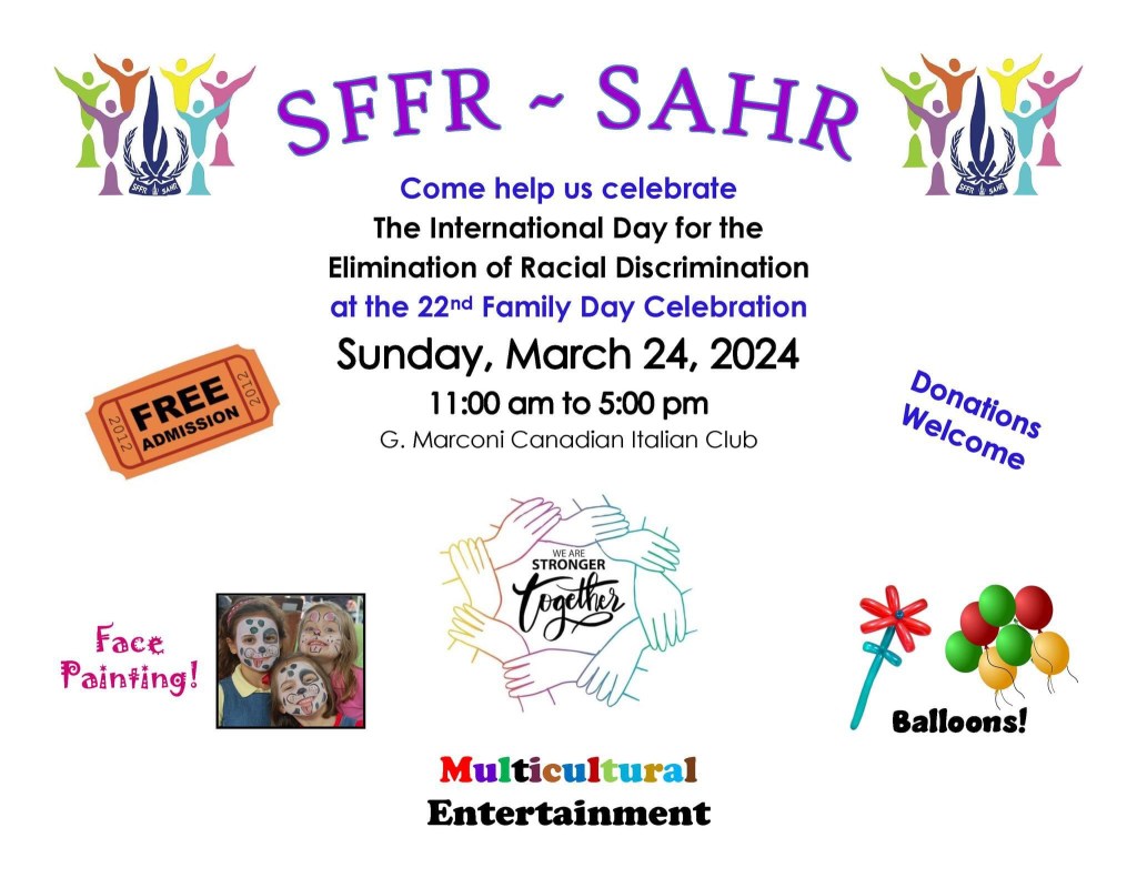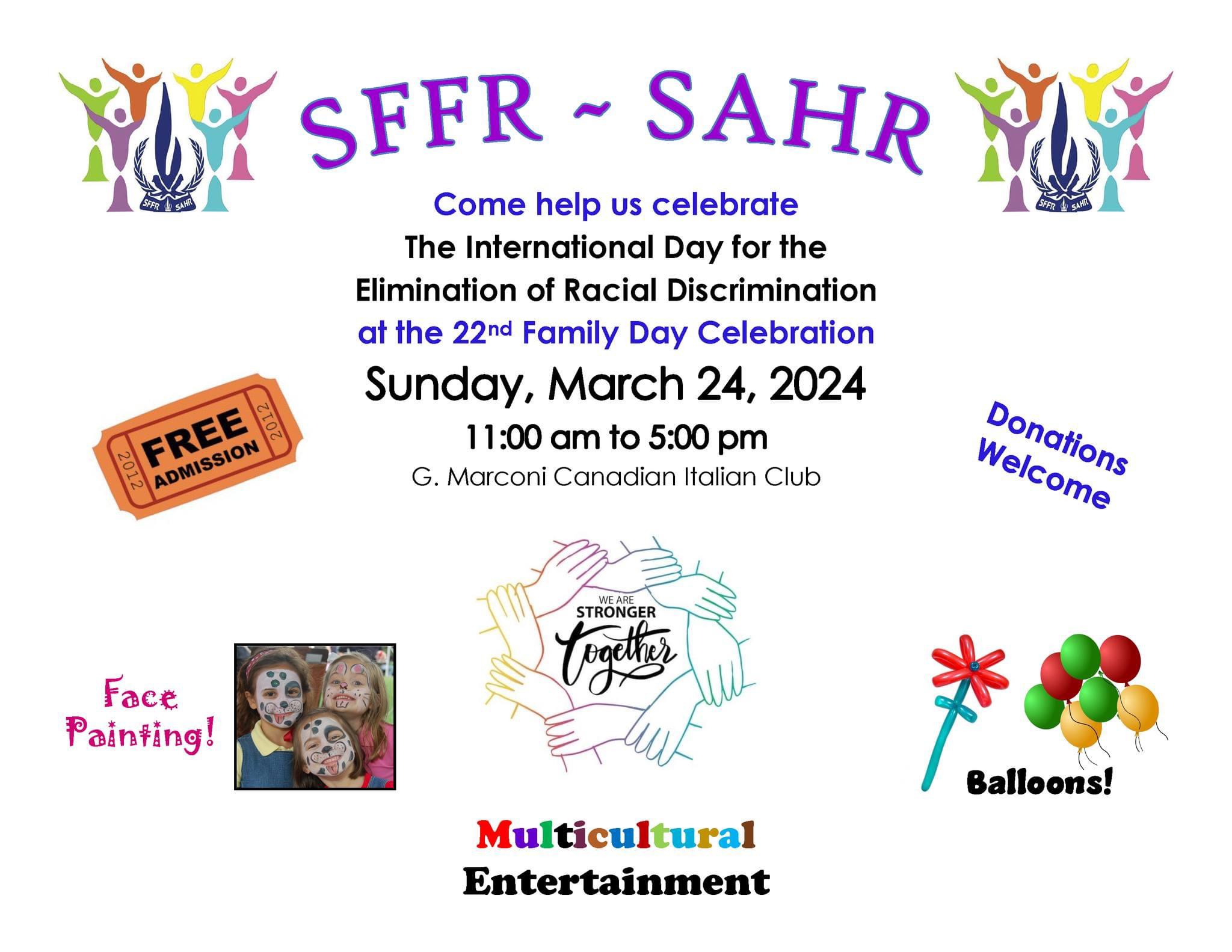 The SFFR/SAHR Committee welcomes you to enjoy the yearly Family Day celebration. If you would like to volunteer to help with Spring Free From Racism please email: sffrsahr@gmail.com
