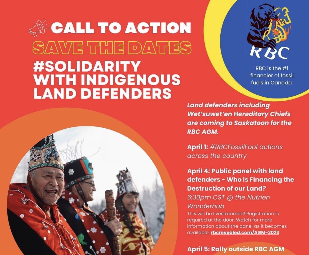 The AGM is a critical opportunity for shareholder to make decisions about how the bank uses their money. So, land defenders including Wet’suwet’en Hereditary Chiefs are coming to Saskatoon too!